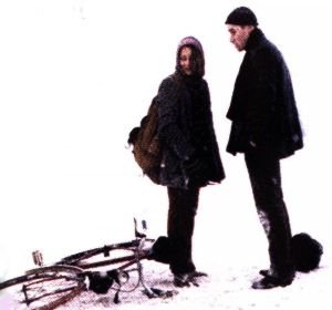 "Egy csendes, titokzatos lány biciklizik a tájban."
